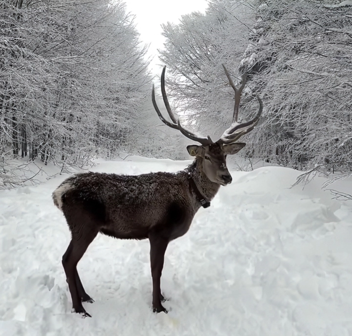 Kar kalınlığının yarım metreyi geçtiği bölgede yürüyüşe çıkan ziyaretçiler, ormanlık alanda dolaşan kızıl geyikleri görme fırsatı da buldu.