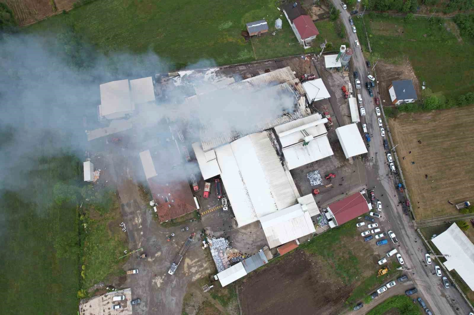 Sakarya’nın Karasu ilçesinde fındık kırım fabrikasında çıkan yangını söndürme çalışmaları devam ederken, ekiplerin mücadelesi ve yangın bölgesi havadan görüntülendi.