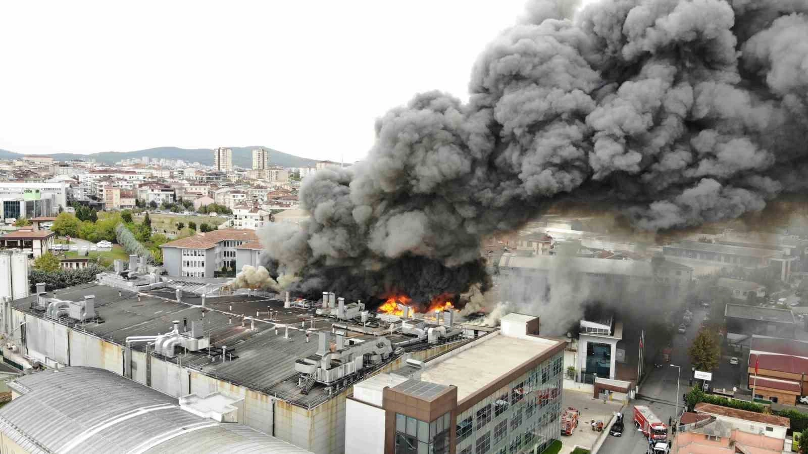 İtfaiye ekiplerinin yangına müdahalesi sürerken, yanan depo ve yükselen dumanlar dron ile havadan görüntülendi.