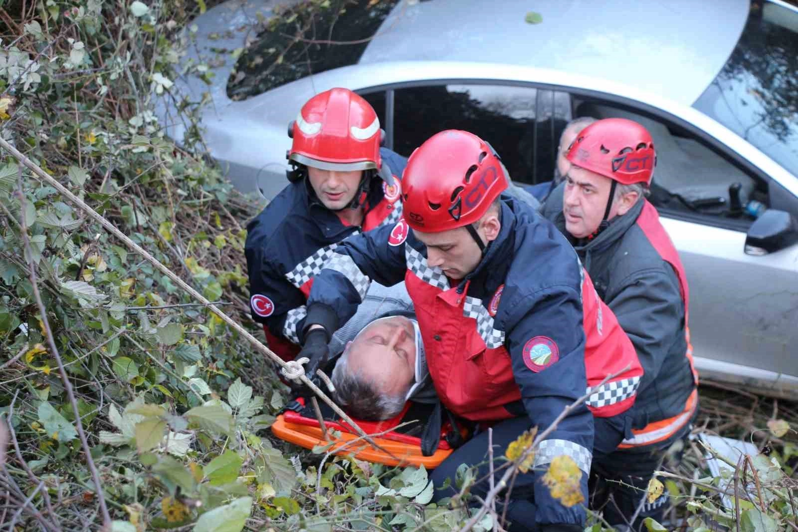 Sakarya’nın Akyazı ilçesinde şarampole uçan otomobilin sürücüsü itfaiye ekiplerince kurtarılarak sağlık ekiplerine teslim edildi.