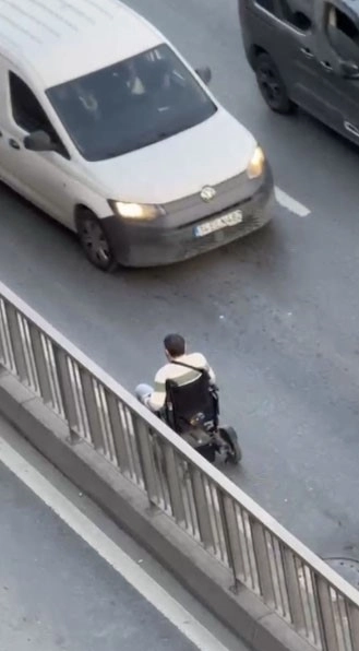 Olay, dün Sultangazi Eski Edirne Asfaltı Caddesi üzerinde meydana geldi. Tekerlekli sandalyeli engelli vatandaş, bilinmeyen bir nedenle kaldırım yerine araç yolunu tercih etti. Trafiğe açık yolda ters yönde ilerleyen vatandaş, sürücülere zor anlar yaşattı. Araçların arasında ilerlemeye çalışan engelli vatandaş, hem kendi canını tehlikeye attı hem de trafik güvenliğini riske soktu. O anlar ise cep telefonu kamerasına yansıdı.