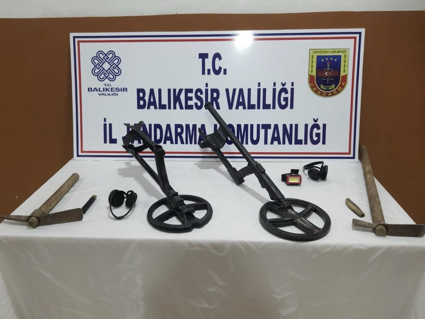 Şüpheliler, ellerinde dedektör ve kazı malzemeleriyle ormanlık alanda dolaşırken tespit edildi.