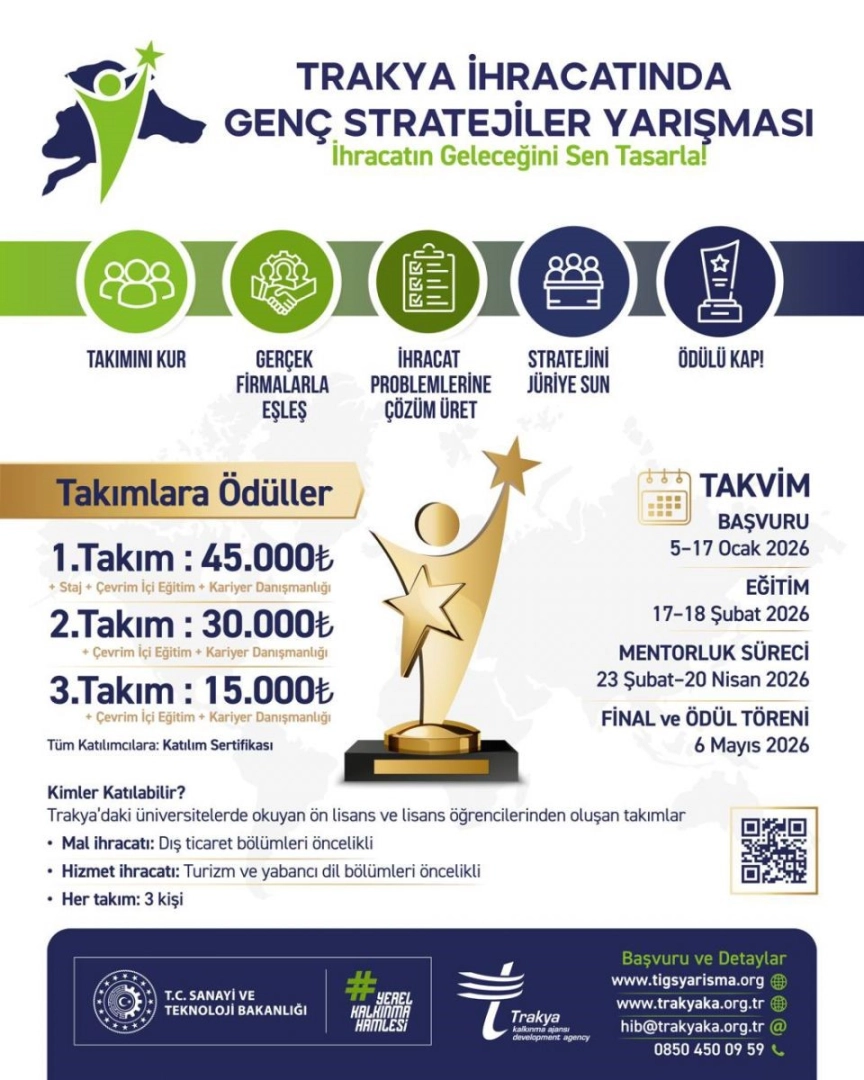 Son yıllarda bölgede ihracat alanında yürüttüğü çalışmalarla öne çıkan Trakya Kalkınma Ajansı, üniversitelerin ön lisans ve lisans programlarında öğrenim gören öğrencilere yönelik "Trakya İhracatında Genç Stratejiler" yarışması düzenleyecek. Yarışma çerçevesinde gençlerin ihracata dönük kariyer fırsatlarıyla buluşturulması, aynı zamanda bölgedeki ihracatçı işletmelere yenilikçi ve uygulanabilir strateji önerileri sunulması amaçlanıyor.