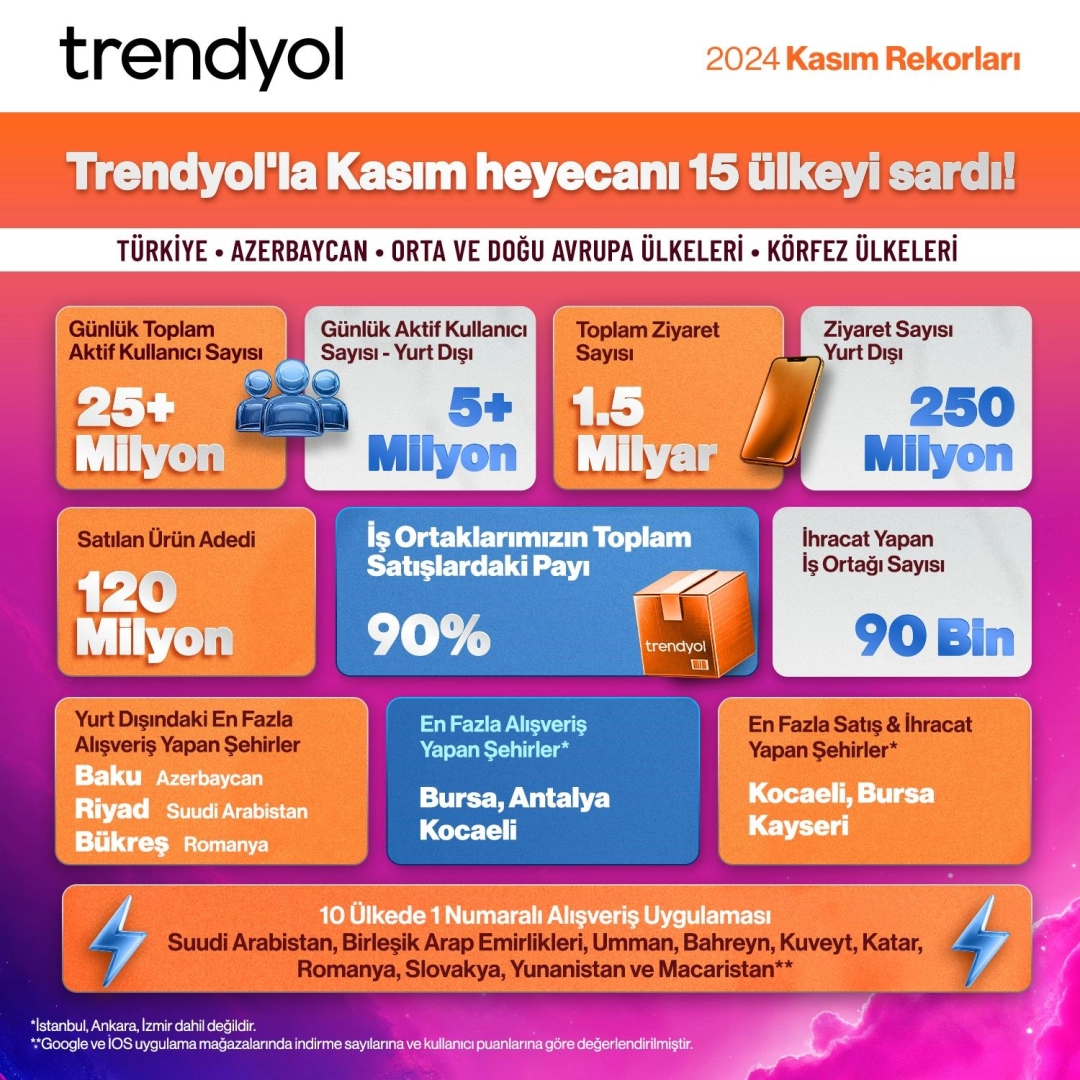 Kasım kampanyası sırasında 25 milyon günlük aktif kullanıcı sayısına ulaşan Trendyol’un, kampanya süresince e-ihracat yapan satıcı sayısı 90 bine ulaştı. Trendyol Kasım ayında 250 milyon kez yurt dışı ziyareti aldı.