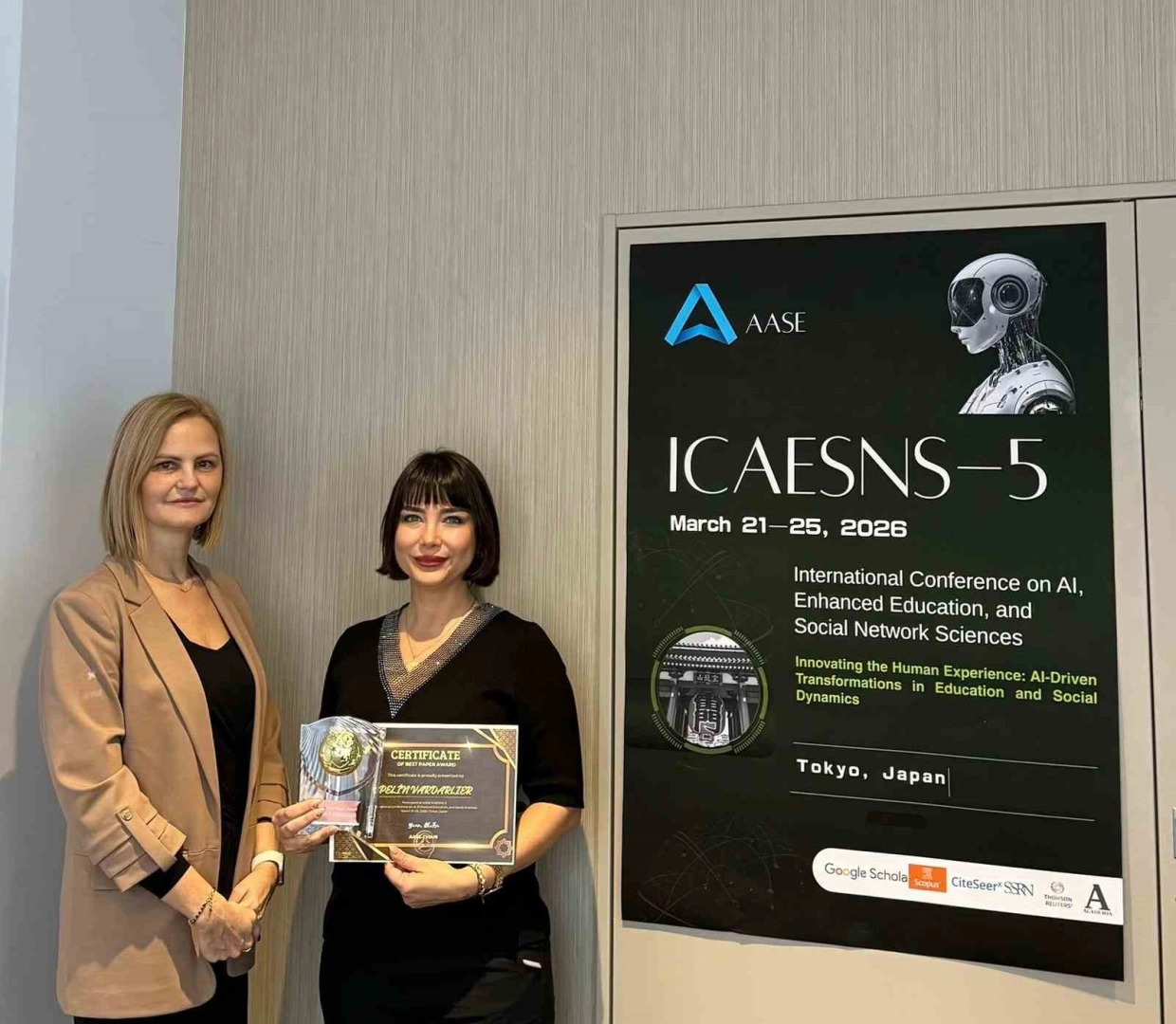 Tokyo’da gerçekleştirilen ve yapay zekâ, eğitim ve sosyal bilimlerin kesişimine odaklanan uluslararası konferansta sunulan "An AI-Driven Model Proposal for Department-Based Promotion Processes in Human Resource Management" başlıklı çalışma, alanında özgün yaklaşımı ve bilimsel katkısıyla dikkat çekti. İnsan kaynakları yönetiminde departman bazlı terfi süreçlerine yapay zekâ destekli bir model öneren çalışma, en iyi bildiri "Best Paper" ödülüne değer görüldü.
