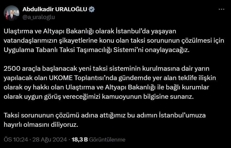 Ulaştırma ve Altyapı Bakanı Abdulkadir Uraloğlu, sosyal medya hesabından yaptığı paylaşımda, “Ulaştırma ve Altyapı Bakanlığı olarak İstanbul’da yaşayan vatandaşlarımızın şikayetlerine konu olan taksi sorununun çözülmesi için Uygulama Tabanlı Taksi Taşımacılığı Sistemi’ni onaylayacağız. 2 bin 500 araçla başlanacak yeni taksi sisteminin kurulmasına dair yarın yapılacak olan UKOME Toplantısı’nda gündemde yer alan teklife ilişkin olarak oy hakkı olan Ulaştırma ve Altyapı Bakanlığı ile bağlı kurumlar olarak uygun görüş vereceğimizi kamuoyunun bilgisine sunarız. Taksi sorununun çözümü adına attığımız bu adımın İstanbul’umuza hayırlı olmasını diliyoruz” ifadelerini kullandı.