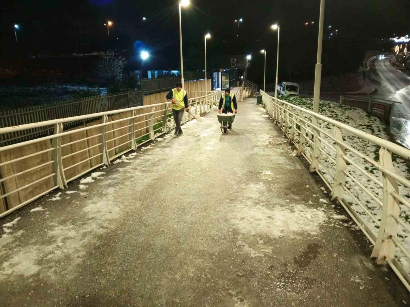 Kocaeli Üniversitesi Hastanesi, fakülte binaları ve yurtlarının da bulunduğu Umuttepe bölgesindeki üst geçitlerde yoğun bir çalışma yürüten ekipler, vatandaşların düşme ve kayma riskine karşı gerekli önlemleri aldı.