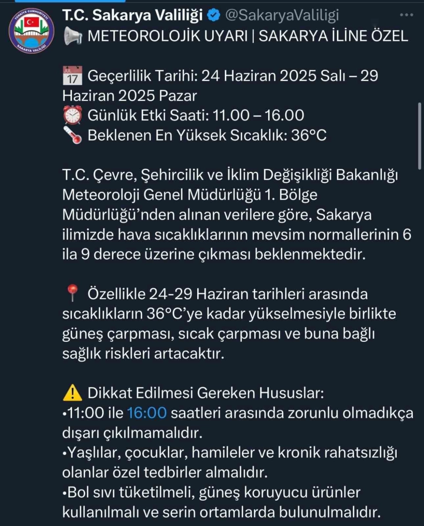 Bu gelişmenin ardından Sakarya Valiliği, özellikle 24-29 Haziran tarihleri arasında yaşanacak aşırı sıcaklara karşı vatandaşları 11.00-16.00 saatleri arasında dışarı çıkmamaları yönünde uyardı.