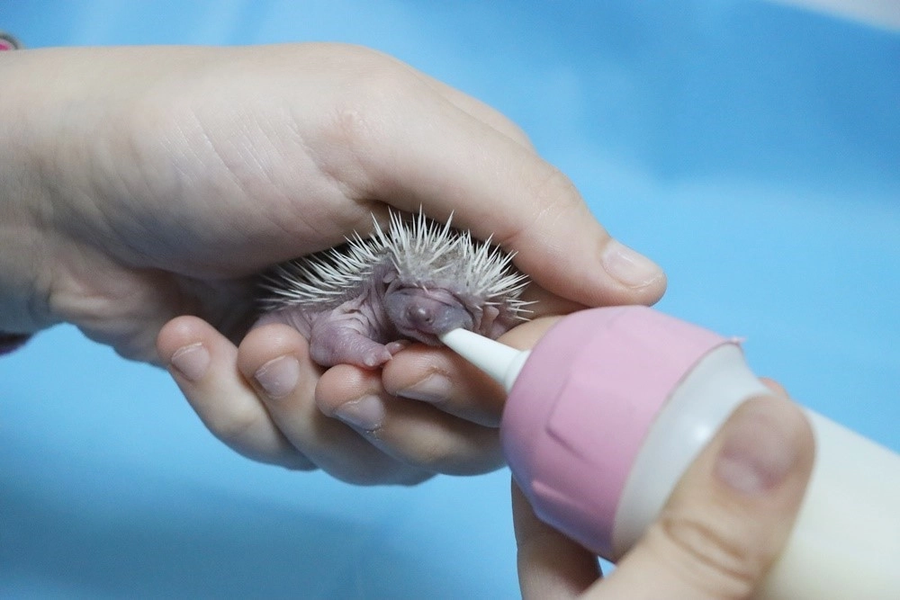 Yalova’da doğada yalnız başına bulunan 3 yavru kirpi kuruma altına alınarak biberonla besleniyor.