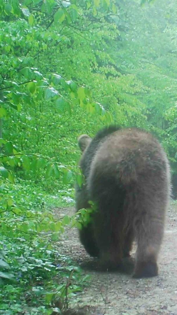 Sakarya’da ormanda gezintiye çıkan boz ayının gezintisi doğasever vatandaşın kurduğu fotokapana yansıdı.