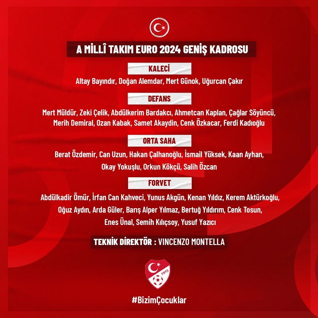 Almanya’nın ev sahipliğinde 14 Haziran-14 Temmuz tarihleri arasında düzenlenecek 2024 Avrupa Şampiyonası (EURO 2024) finallerine katılacak A Mili Takım’ın geniş kadrosu açıklandı. Teknik Direktör Vincenzo Montella tarafından belirlenen listede 35 futbolcu bulunuyor. Kadroya davet edilen oyuncular şöyle:
