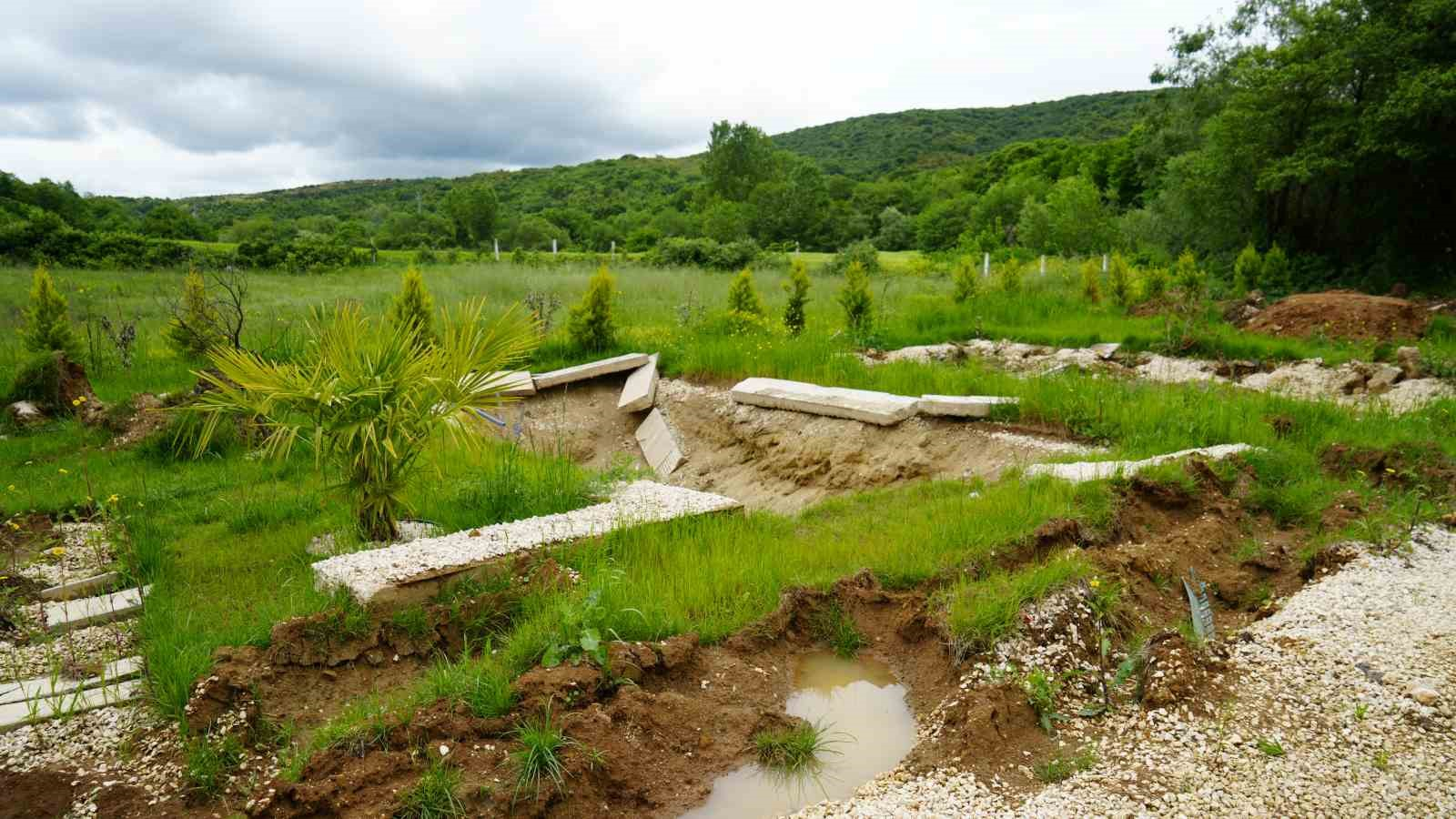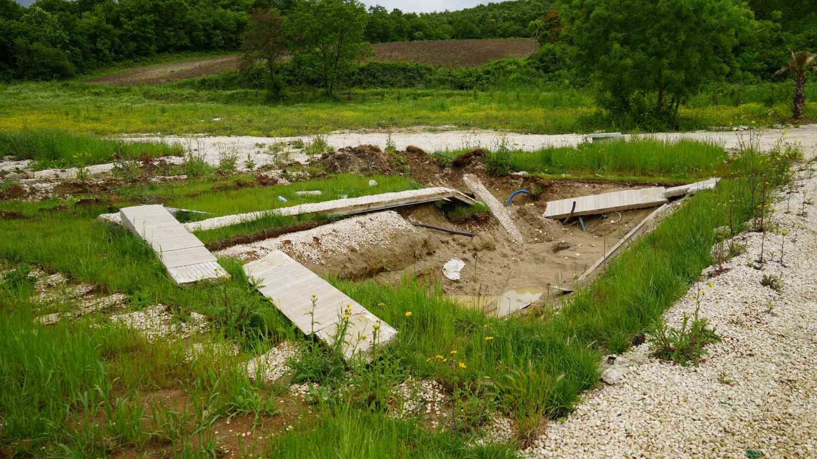 Çatalca’da 5 adet bungalov alan vatandaşların evleri, havuzlarıyla birlikte çalındı. İddiaya göre, bungalovları inşa eden şahısla, bir ev sahibi arasındaki alacak verecek meselesinden dolayı alacaklı kişi evleri havuzlarıyla birlikte çaldı. Bungalovlardan geriye kalan çakıl taşlarının bulunduğu arazi havadan görüntülendi.