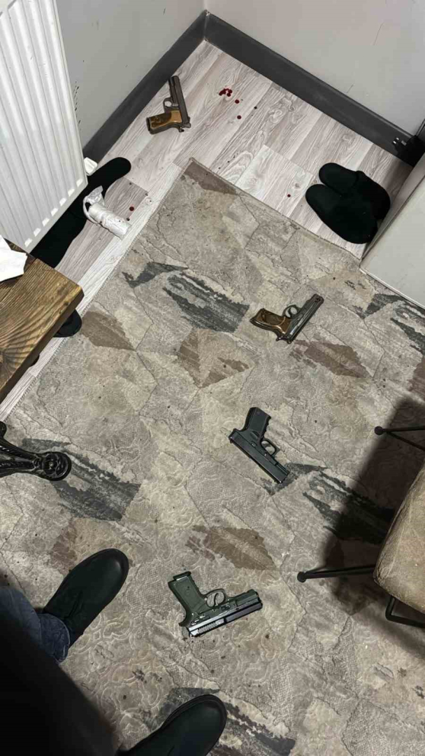 En üst kattaki dairenin kilidinin uyduğunu fark eden Beyoğlu Asayiş Büro Amirliği polisleri, içeriye girdiğinde çok miktarda kan olduğunu gördü. Şahsın daire içerisinde vurulduğunu belirleyen polis, yaptığı aramalarda yerde 4 adet ruhsatsız tabanca ele geçirdi. Devam eden aramalarda ise avizenin ve çekmecenin içerisinde yaklaşık 47 gram “bonzai” diye tabir edilen uyuşturucu madde ile hassas terazi ele bulundu.