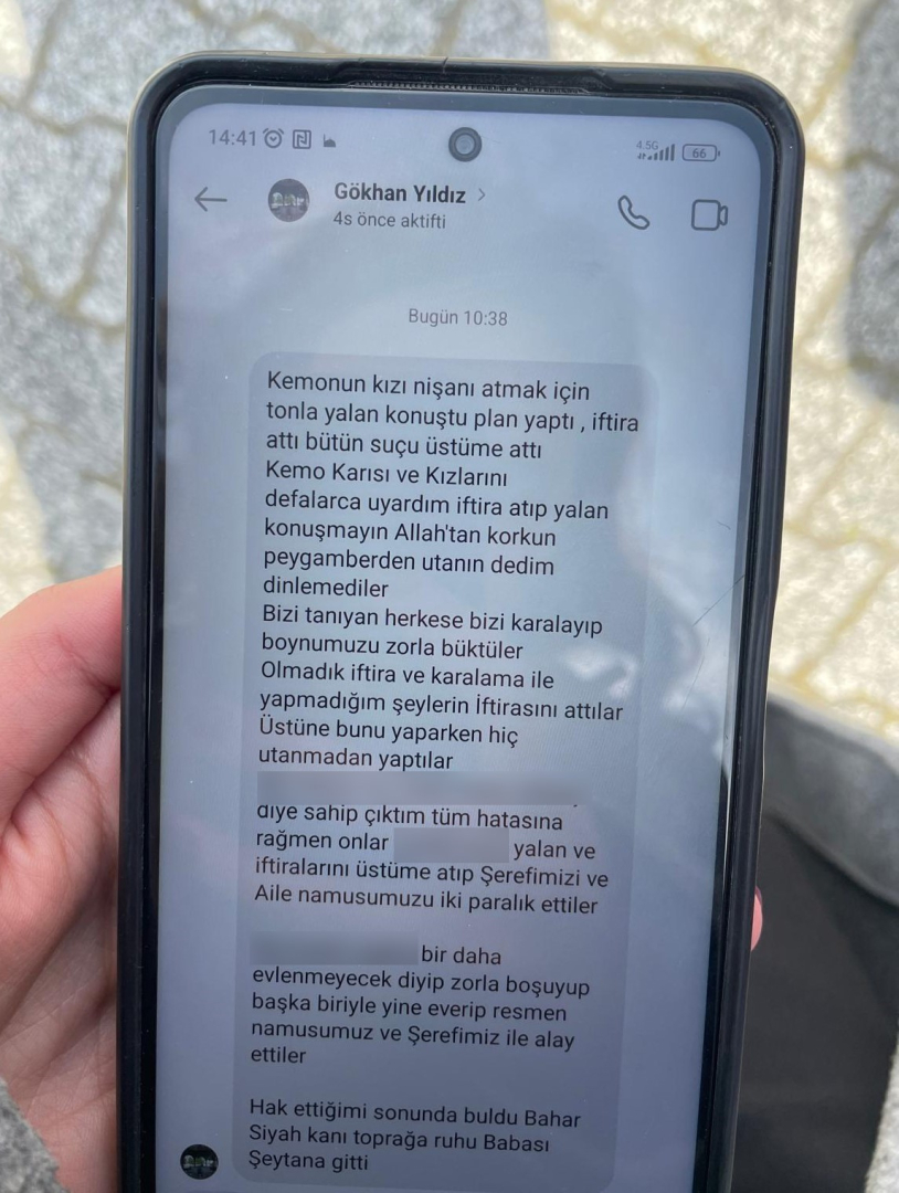 Zanlı Gökhan Yıldız’ın cinayetin ardından Bahar Kaban’ın yakınlarına mesaj attığı ortaya çıktı. Firari olan Yıldız’ın mesajında "Hak ettiğini buldu Bahar. Siyah kanı toprağa, ruhu babası şeytana gitti" ifadeleri dikkat çekti.