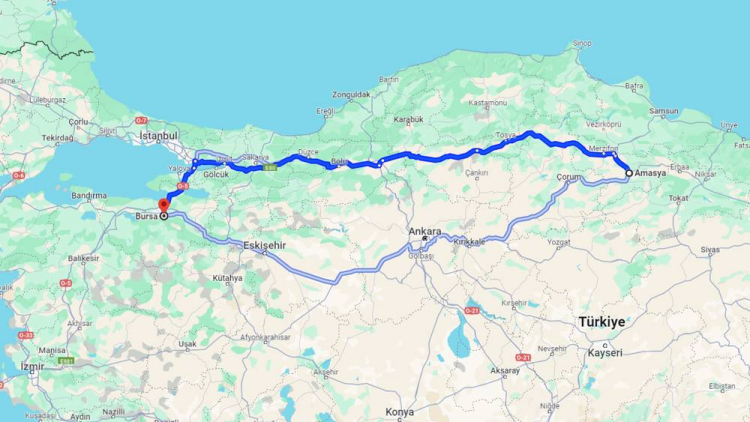 Bursa'dan Amasya'ya gitmek isteyenler, genellikle Ankara üzerinden geçen güzergahı kullanarak bu mesafeyi kat ederler. Bu güzergah, otoban ve bölünmüş yolları içerdiği için yolculuğun daha rahat ve güvenli geçmesini sağlar. Özellikle özel araçla seyahat edenler için bu güzergah tercih edilen bir rotadır.