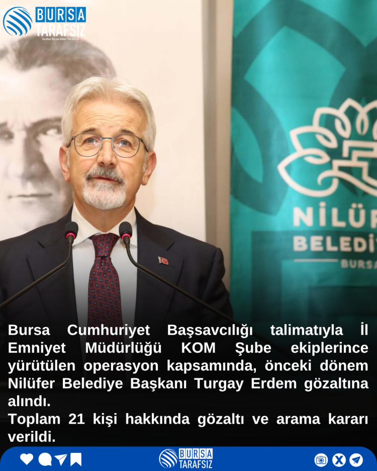 Bursa Cumhuriyet Başsavcılığı talimatıyla yürütülen soruşturma kapsamında, Nilüfer Belediyesi’nin eski başkanı Turgay Erdem gözaltına alındı.