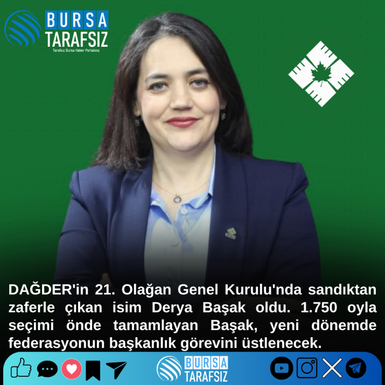 Bursa’da faaliyet gösteren Dağ-Der (Bursa Dağ-Dernekleri Federasyonu), 21. Olağan Genel Kurulu’nu büyük bir katılımla gerçekleştirdi. Sandık sonuçlarına göre Derya Başak, toplam 1.750 oy alarak açık ara farkla birinci oldu ve başkanlık yarışını önde tamamladı.