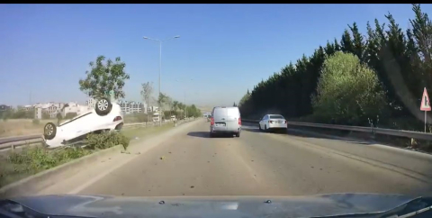 Takla atan araçta bulunan karı-koca kazayı yara almadan atlatırken, o anlar araç içi kamerasına yansıdı.