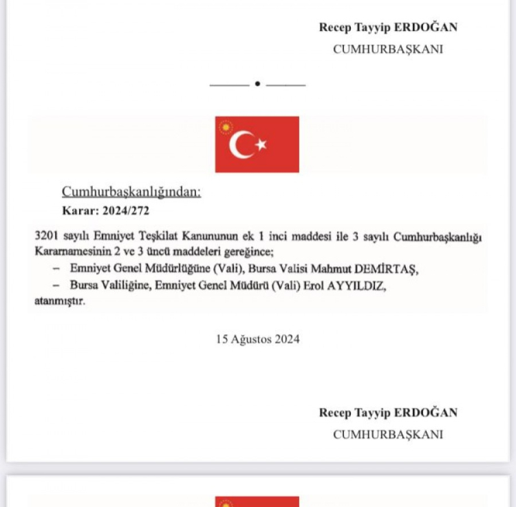 Bursa Valisi Mahmut Demirtaş, Emniyet Genel Müdürlüğü'ne atandı.