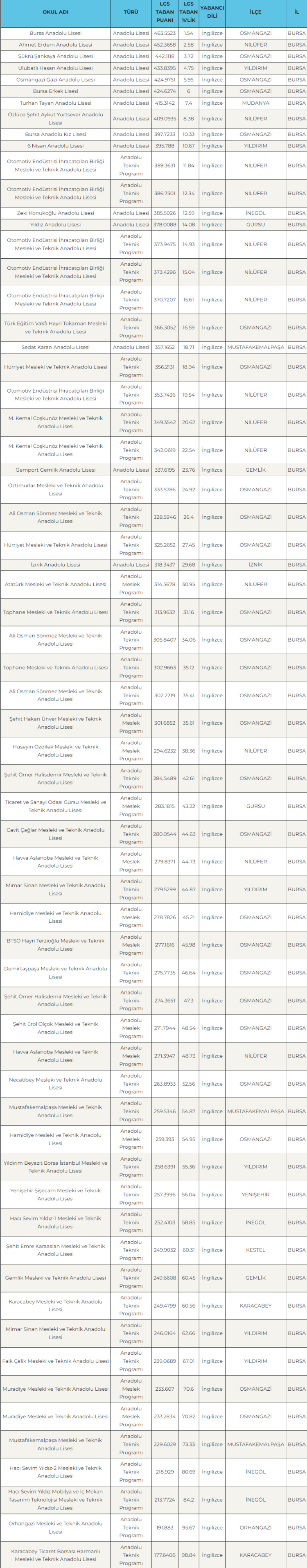 Bursa Liseleri 2025 Taban Puanları Yüzdelik Dilimleri LGS-MEB