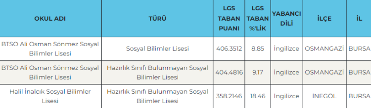 Bursa Sosyal Bilimler Liseleri Taban Puanları ve Yüzdelik Dilimleri 2024