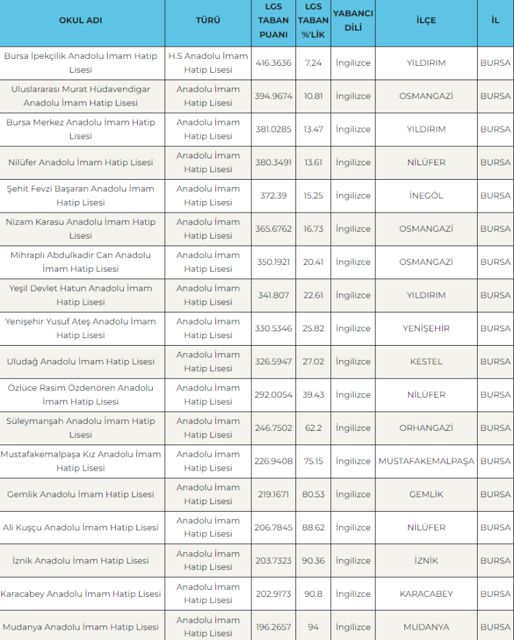 Bursa Anadolu İmam Hatip Liseleri Taban Puanları ve Yüzdelik Dilimleri 2024