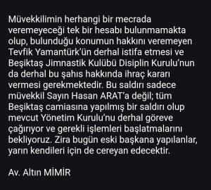 Siyah-beyazlı camianın Divan Kurulu Başkanı Tevfik Yamantürk’ün istifa etmesi gerektiğini vurgulayan Altın Mimir, "Bu noktada şunu da belirtmek isteriz ki müvekkil ve yönetimi hakkında ileri geri konuşanlar her ne hikmetse aylardır somut bir delil, belge sunamamakta, sadece suyu bulandırıp iftiralarıyla kamuoyunu meşgul etmeye çalışmaktadırlar. Müvekkilimin herhangi bir mecrada veremeyeceği tek bir hesabı bulunmamakta olup, bulunduğu konumun hakkını veremeyen Tevfik Yamantürk’ün derhal istifa etmesi ve Beşiktaş Jimnastik Kulübü Disiplin Kurulunun da derhal bu şahıs hakkında ihraç kararı vermesi gerekmektedir. Bu saldırı sadece müvekkil Hasan Arat değil, tüm Beşiktaş camiasına yapılmış bir saldırı olup mevcut yönetim kurulunu derhal göreve çağırıyor ve gerekli işlemleri başlatmalarını bekliyoruz. Zira bugün eski başkana yapılanlar, yarın kendileri için de cereyan edecektir" ifadelerine yer verdi.