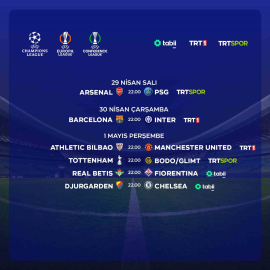 UEFA Şampiyonlar Ligi, Avrupa Ligi ve Konferans Ligi’nde yarı final kapsamında 29 Nisan-1 Mayıs tarihlerinde oynanacak 6 karşılaşma, TRT 1, TRT Spor ve tabii platformunda futbolseverlerle buluşacak