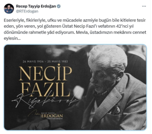 Cumhurbaşkanı Recep Tayyip Erdoğan, Necip Fazıl Kısakürek’in vefatının 42’nci yıl dönümü dolayısıyla sosyal medya hesabından bir mesaj yayımladı