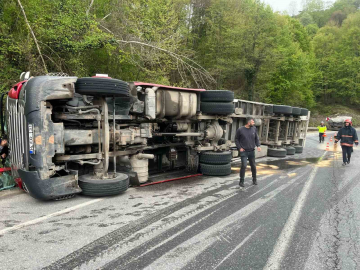 Sakarya’nın Akyazı ilçesi D-140 kara yolunda sürücüsünün kontrolünden çıkan tır devrildi