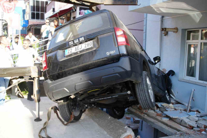 Edirne’de direksiyon kontrolü kaybedilen cip bir iş yerinin balkonunu yıktı ve apartmanın duvarına çarparak askıda kaldı