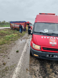Balıkesir’in Manyas ilçesinde aşırı yağış nedeniyle kayganlaşan yolda sürücüsünün direksiyon hakimiyetini kaybettiği kamyon yoldan çıktı
