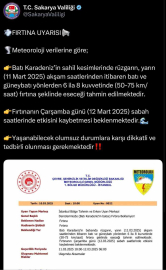 Meteoroloji Genel Müdürlüğü’nden elde edilen bilgilerin neticesinde Sakarya Valiliği, sosyal medya hesabı üzerinden şehrin sahil kesimleri için yarın akşam saatlerinden itibaren etkili olması beklenen kuvvetli fırtınaya karşı vatandaşları uyardı. Yaşanabilecek olumsuz durumlara karşı Valiliğin sosyal medya hesabından yapılan paylaşımda, "Batı Karadeniz’in sahil kesimlerinde rüzgarın, yarın akşam saatlerinden itibaren batı ve güneybatı yönlerden 6 ila 8 kuvvetinde (50-75 km/saat) fırtına şeklinde eseceği tahmin edilmektedir. Fırtınanın Çarşamba günü sabah saatlerinde etkisini kaybetmesi beklenmektedir. Yaşanabilecek olumsuz durumlara karşı dikkatli ve tedbirli olunması gerekmektedir" denildi.