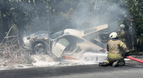 Kaza yapan sürücü araçtan çıktıktan kısa süre sonra lüks otomobil alev aldı. Yangın itfaiye ekipleri tarafından söndürüldü.