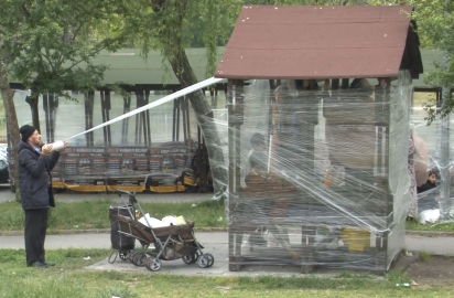 Soğuktan korunmak için bankların ve ağaçların etrafını streç ile kapladılar
