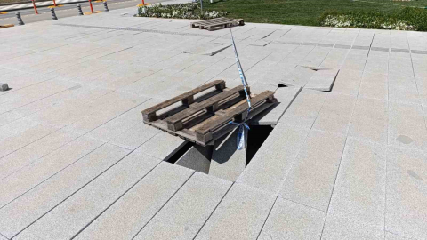 Kırık alanlar tahta paletlerle kapatılmak zorunda kaldı ancak bu geçici çözüm, yayalar için büyük bir tehlike oluşturuyor