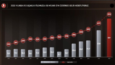 Türk Hava Yolları (THY), 500’üncü uçağının bu yıl filoya katılacağını ve 2033 yılında ise 50 milyar doların üzerinde gelirle 813 uçaklık filo hedeflediklerini duyurdu.