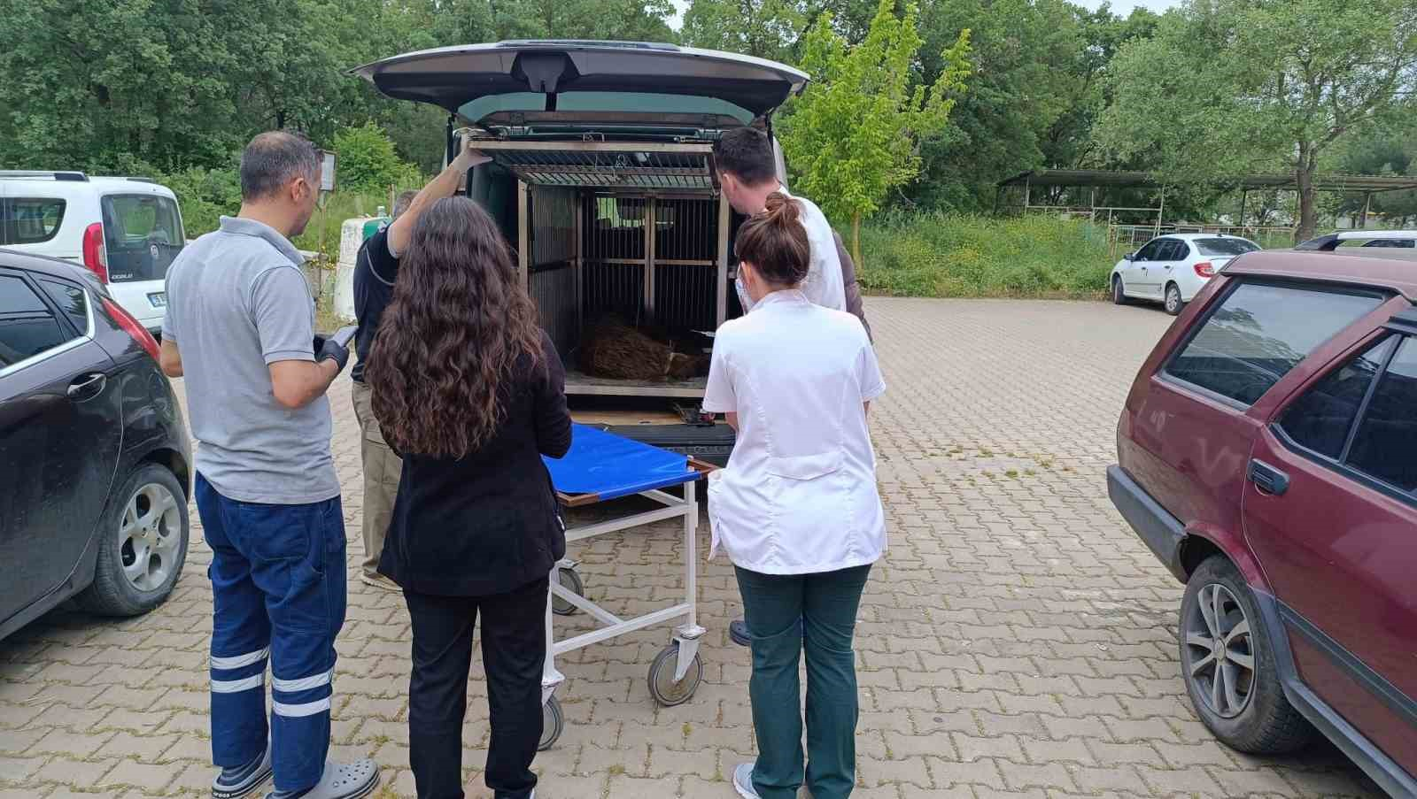 Sabahın ilk ışıklarıyla ayının izini sürmeye devam eden ekipler yaralı ayıya Yiğitali Mahallesinin yaklaşık 2 kilometre üzerinde ormanlık alandaki dere yatağında ulaştı. Ekipleri fark eden yaralı ayı, arka ayaklarını kullanamamasına rağmen sürünerek dere yatağından aşağıya doğru kaçtı. Jandarma ve DKMP ekipleri bunun üzerine sahaya dağılıp yaralı ayının önünü keserek daha fazla kaçmasına engel oldu. Ekipler tarafından kıstırılan 2 yaşındaki genç ayı, veteriner hekimler tarafından uyuşturucu iğne atılarak bayıltıldı. Ayının bulunduğu bölgeye inen ekipler, pençelerini ve ağız kısmını sargı beziyle sarıp ayının saldırma ihtimaline karşı tedbir aldı. Urgan yardımıyla dere yatağından Jandarma ve DKMP ekipleri tarafından yukarıya taşınan 100 kiloluk ayı, DKMP ekiplerinin getirdiği kafese konularak araçla Uludağ Üniversitesi Veterinerlik Fakültesine götürüldü. Görevli veteriner hekimler tarafından sedye ile içeriye alınan ayının çekilen röntgeninde kalça kemiğinde birden fazla kırığın olduğu belirlendi. Ameliyata alınan ayının buradaki tedavisinin ardından Karacabey Ovakorusu Celal Acar Yaban Hayvanı Kurtarma ve Rehabilitasyon Merkezine götürüleceği, tedavi sürecine burada devam edileceği öğrenildi.