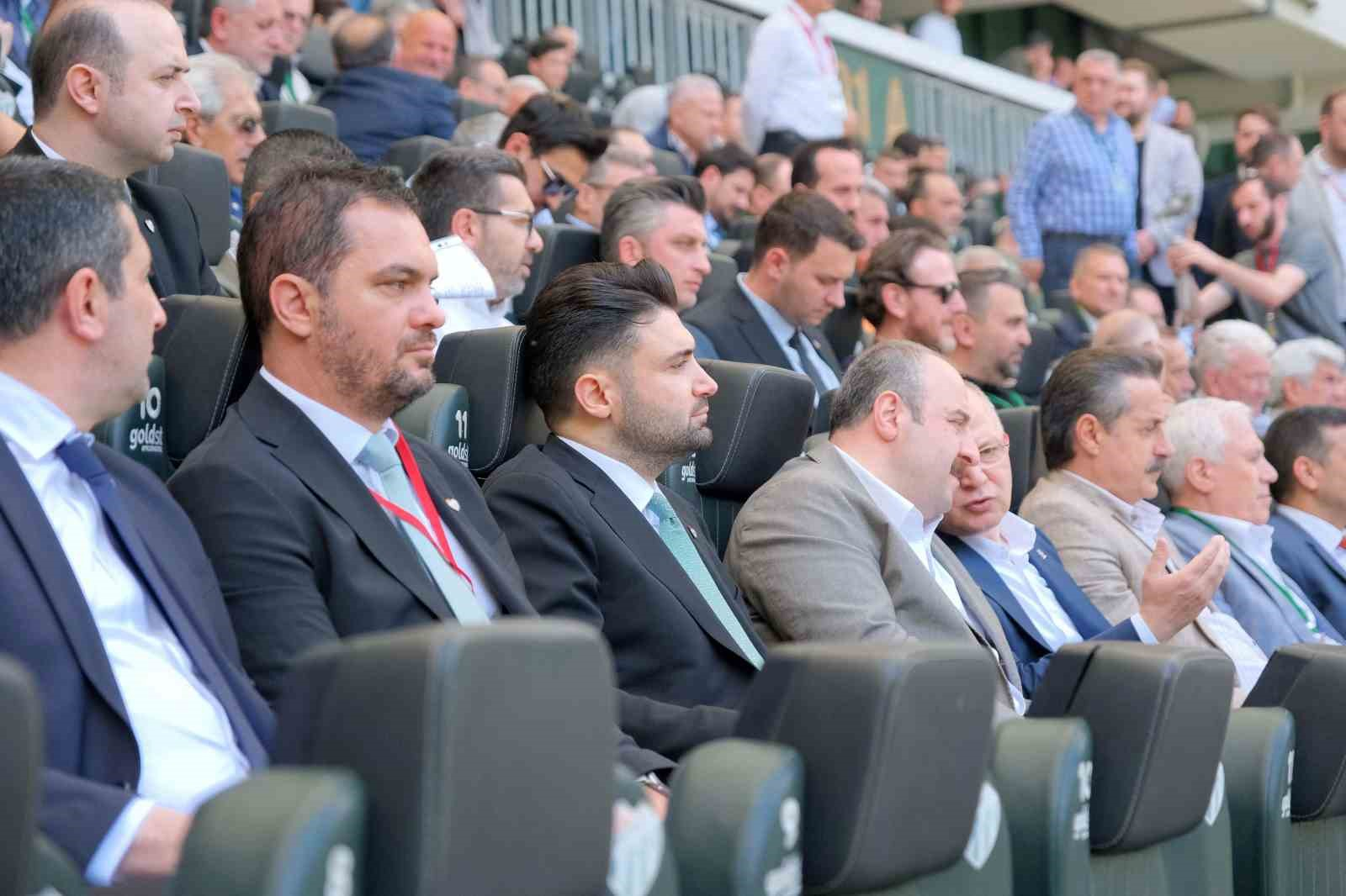 Eski Sanayi ve Teknoloji Bakanı Mustafa Varank da Bursaspor Olağan Genel Kurulu’nda konuştu. Varank, “Bursa, Türkiye’nin potansiyeli en yüksek şehirlerinden bir tanesidir. Türkiye’nin marka şehirlerinin başında geliyor. Ben de son seçimlerden itibaren siz değerli hamsilerimizin teveccühle bu markayı nasıl yükseltiriz diye çalışmaya devam ediyorum. Bu şehrin en önemli markası da Bursaspor. Sadece Bursalıların gönlünde değil Anadolu’nun da gönlünde taht kurdu Bursaspor. 2010’da büyük başarıya imza atmış bir futbol kulübü. Bu marka değerimizi eski şanlı günlerine taşımak istiyoruz. Bursaspor’umuzu sadece Türkiye’de değil Avrupa’da da yoluna emin adımlarla devam eden bir kulüp haline getirelim. Bunun yolu da birlik olmaktan geçiyor. Bursa’da bir yürüdüğümüzde ‘Sayın bakanım Bursaspor’a sahip çıkın’ diyorlar. Farklı bir Bursaspor inşa etmeye başladık. Buna da devam edeceğiz. Uludağ OSB’de Enes Çelik’in ne kadar becerikli ve Bursaspor sevdalısı olduğunu net bir şekilde gördüm. Bu ekip Bursaspor’u çok farklı yerlere getirecektir. İş dünyasının da kulübe sahip çıkması lazım. Herkes her konuda taşın altına elini koyacak. Gaziantep’te, Kayseri’de, Konya’da gördüm. İş insanlarının sahip çıkmasıyla neler olabileceğini gördüm. Bursaspor’a da sahip çıkın. Bu takımın önünü hep birlikte açalım. Şampiyon Bursaspor’u tekrar Türkiye’nin gündemine sokacağız” ifadelerini kullandı.