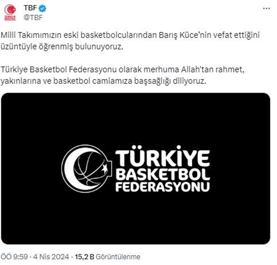 Türkiye Basketbol Federasyonunun (TBF), A Ulusal Basketbol Ekibi'nin eski oyuncularından Barış Küce’nin 78 yaşında hayatını kaybettiğini duyurdu