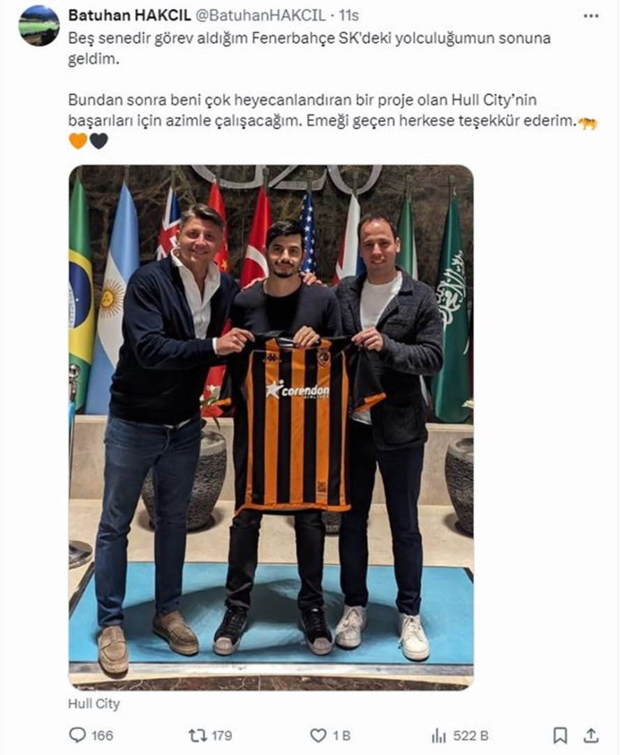 Fenerbahçe teknik heyetinde şef scout olarak vazife yapan Batuhan Hakcıl, sarı-Lacivertlilerden ayrılarak Hull City'ye gittiğini duyurdu.