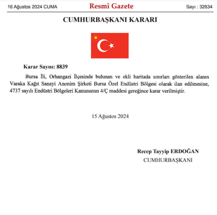 Yayımlanan Cumhurbaşkanlığı kararnamesinde fabrika arsası Özel Endüstri Bölgesi ilan edildi.